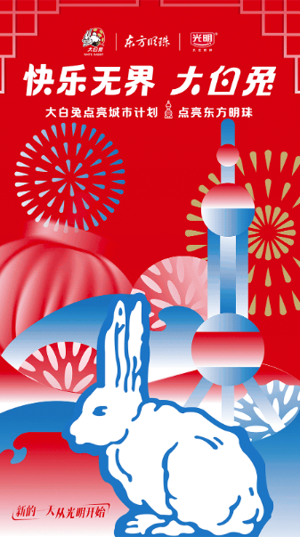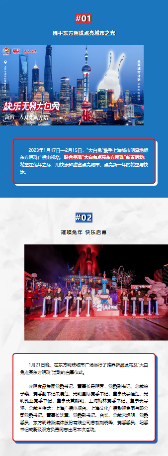 2023年1月17日——2月15日,“大白兔”攜手上海城市明星地標(biāo)東方明珠廣播電視塔 聯(lián)合呈現(xiàn)“大白兔點亮東方明珠”新春活動 希望在兔年之際,用快樂和甜蜜點亮城市、點亮新一年的希望與快樂。